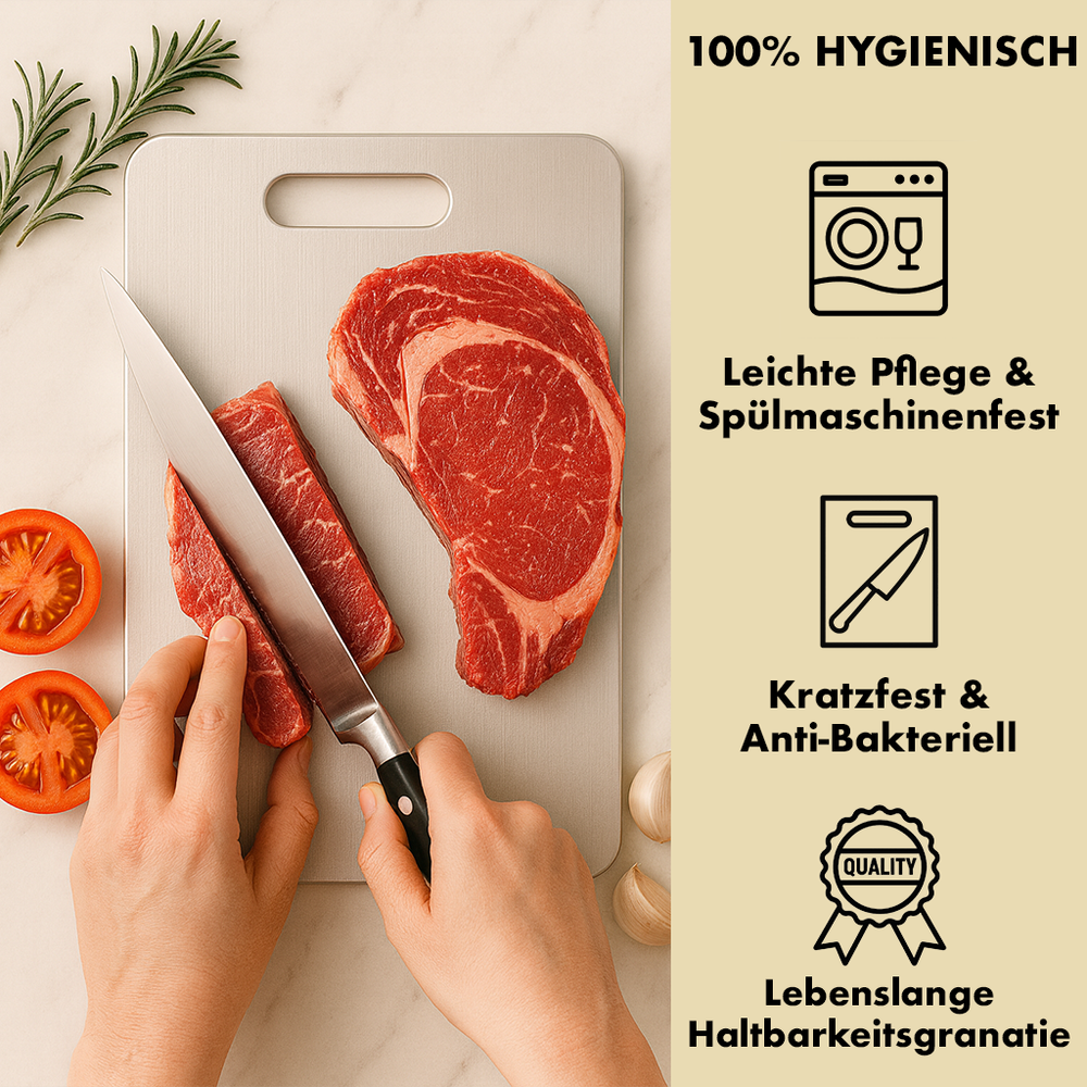 Das Titanschmied™ Titan-Schneidebrett ist Ihr ultimativer Schutzschild gegen versteckte Bakterien, hartnäckige Gerüche und schädliche Toxine. Gefertigt aus 100 % reinem Titan der Güteklasse 1, ist es von Natur aus bakterienresistent und hält Mikroplastik fern von Ihren Lebensmitteln – für eine sicherere, sauberere und gesündere Zubereitung Ihrer Mahlzeiten, Tag für Tag.